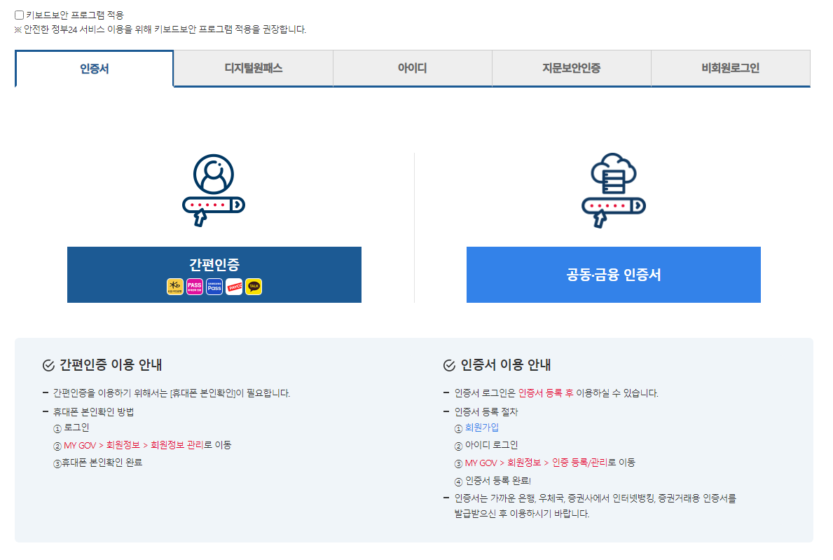 간편인증(간편인증의 경우 휴대폰 본인확인 필요) 또는 공동·금융인증서 로그인 (공동·금융인증서의 경우 먼저 인증서 등록 후 이용가능)