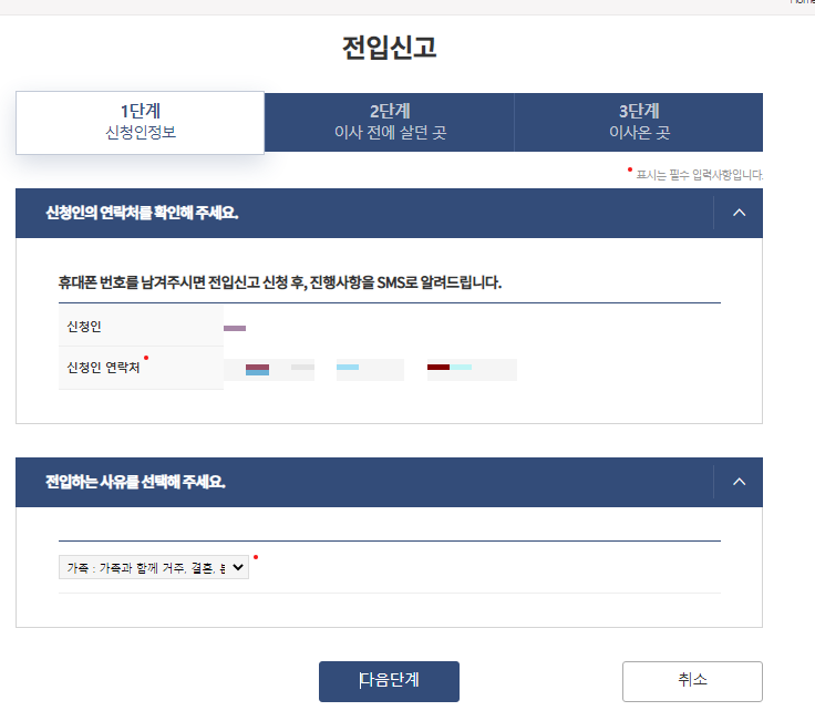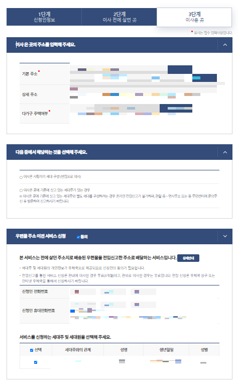 간편인증 로그인을 하게되면 3단계로 정보를 입력해야한다. 신청인정보 → 이사 전에 살던 곳 → 이사온 곳