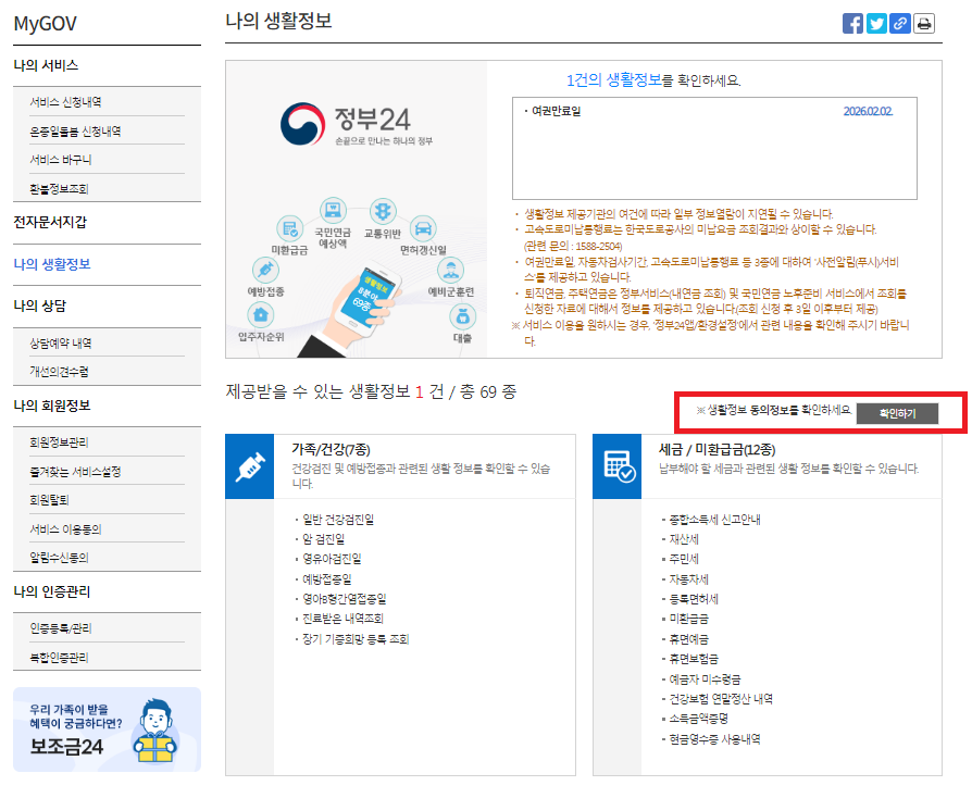 3. 생활정보 동의정보를 확인하세요 확인하기 클릭