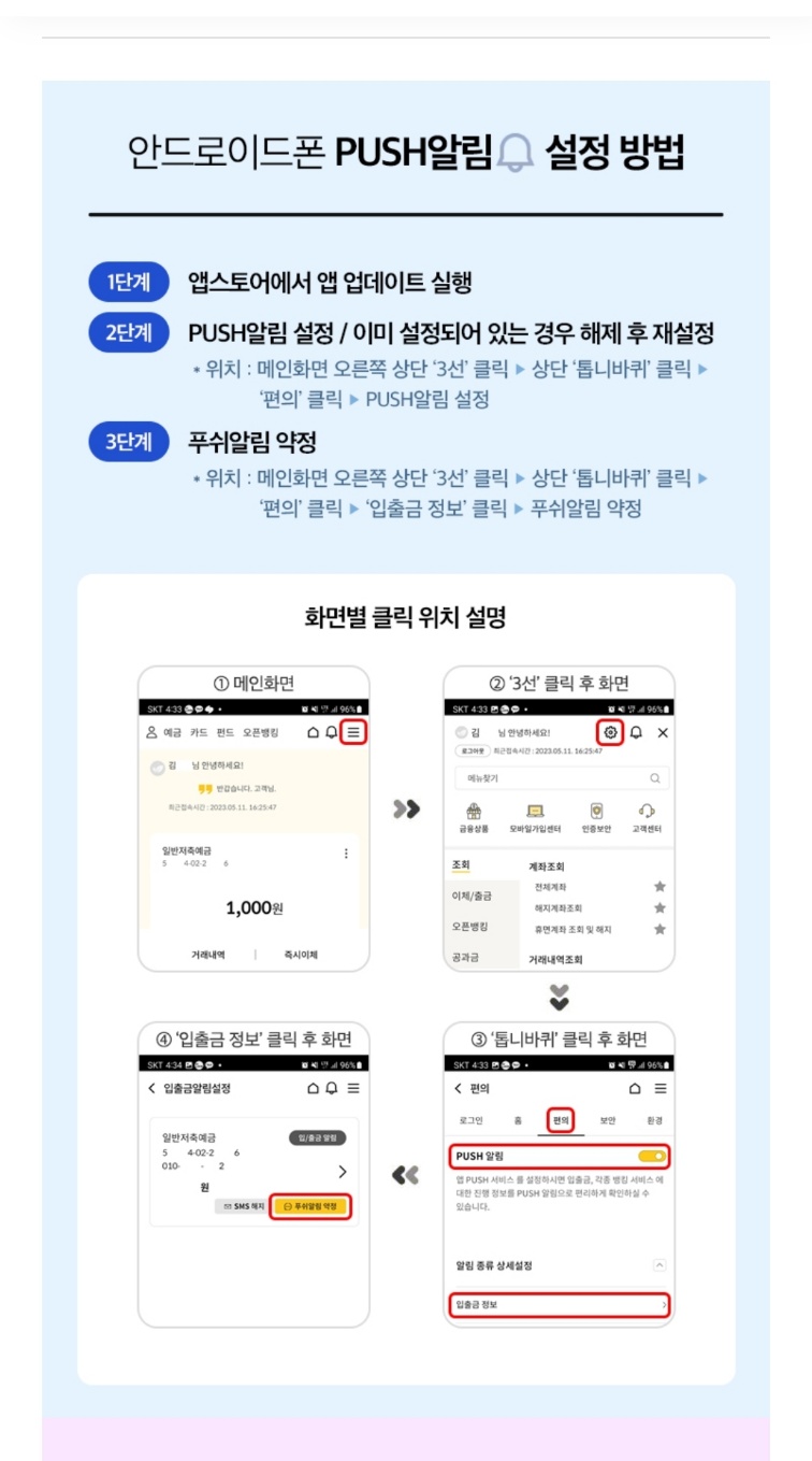 1. 첫번째는 우체국모바일뱅킹을 들어가서 푸쉬알림을 설정하는 방법이다.
