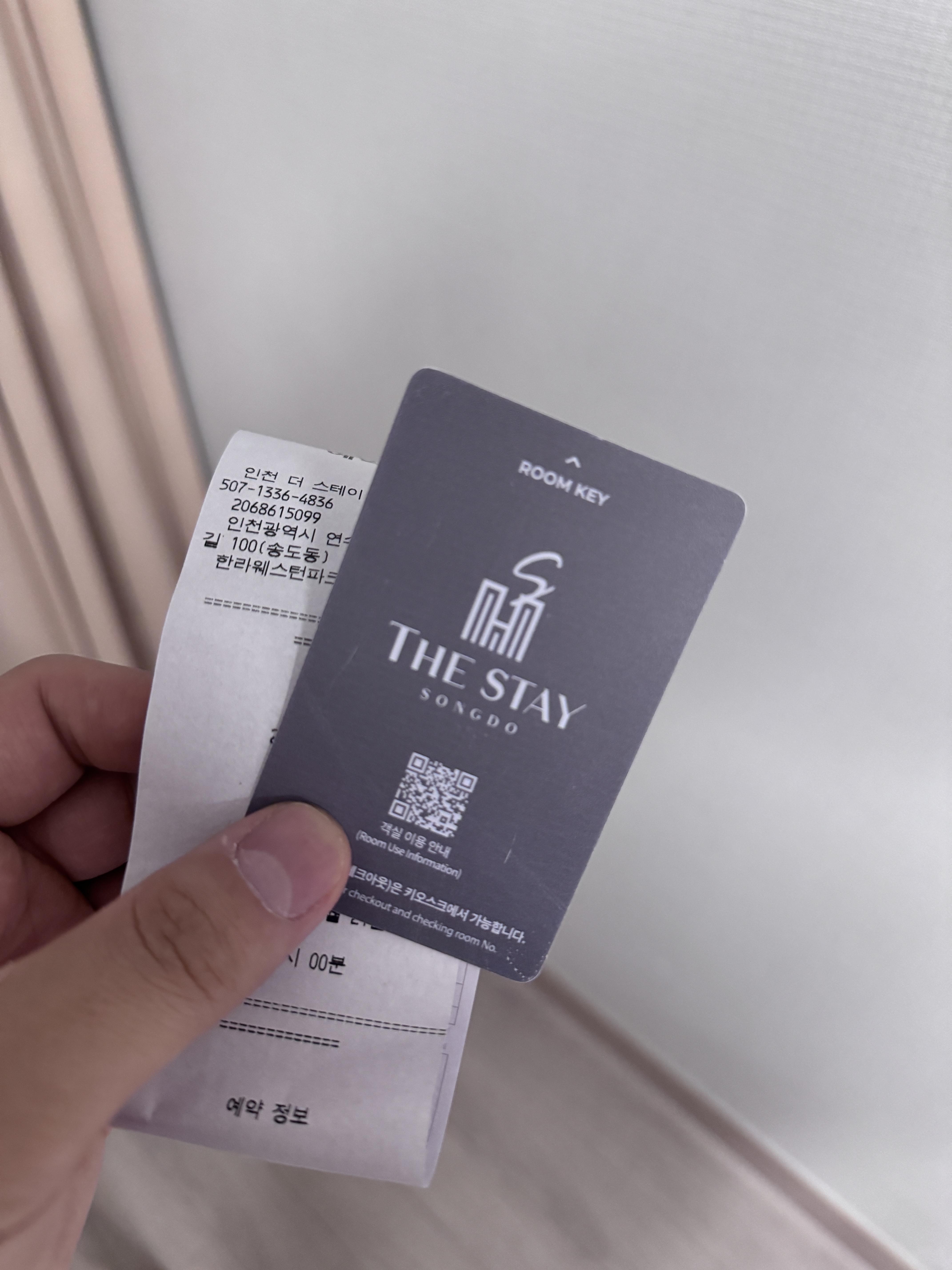 더스테이송도 키오스크로 체크인을 진행하면 사진과 같이 영수증과 룸키가 나온다.
