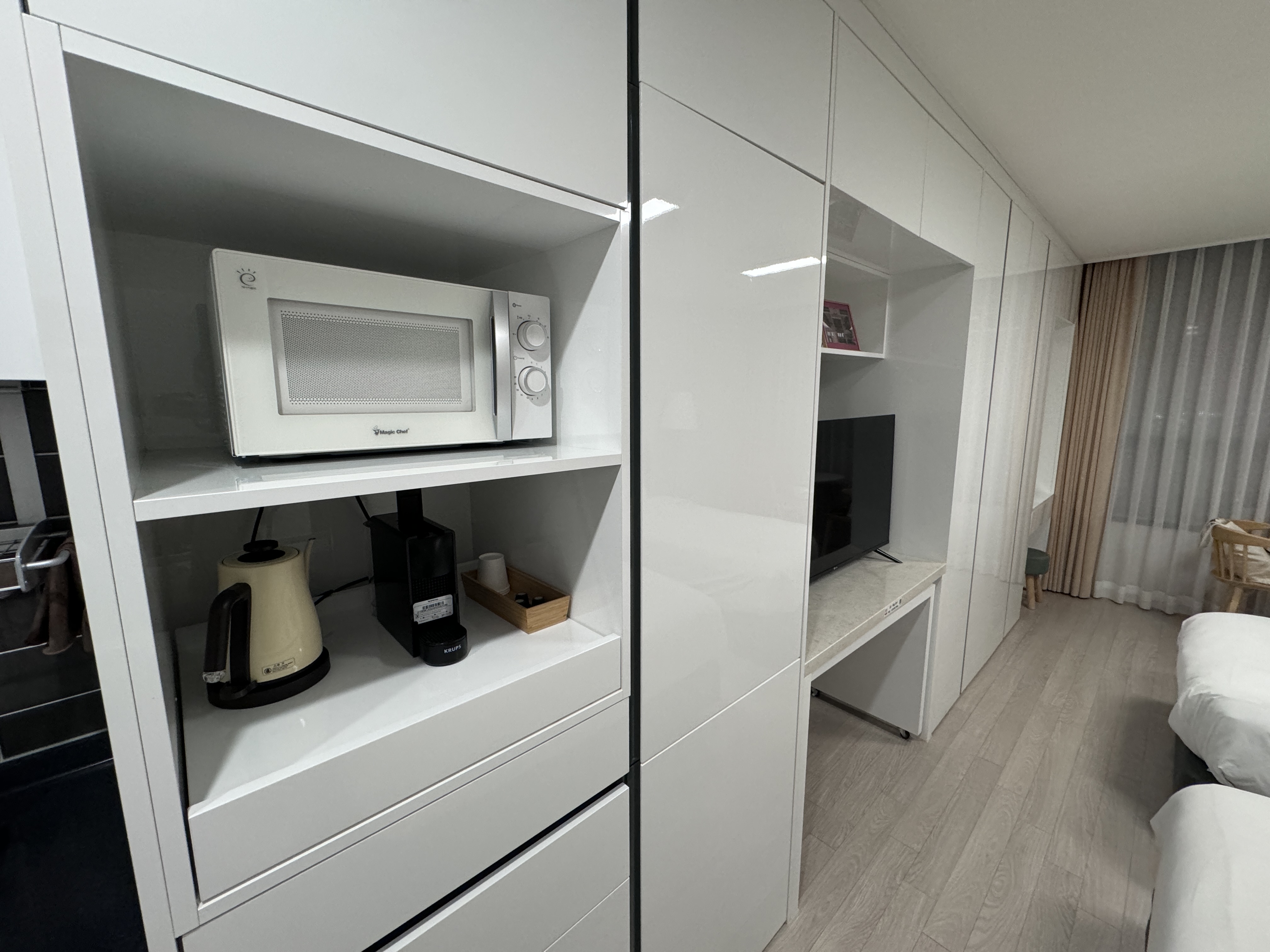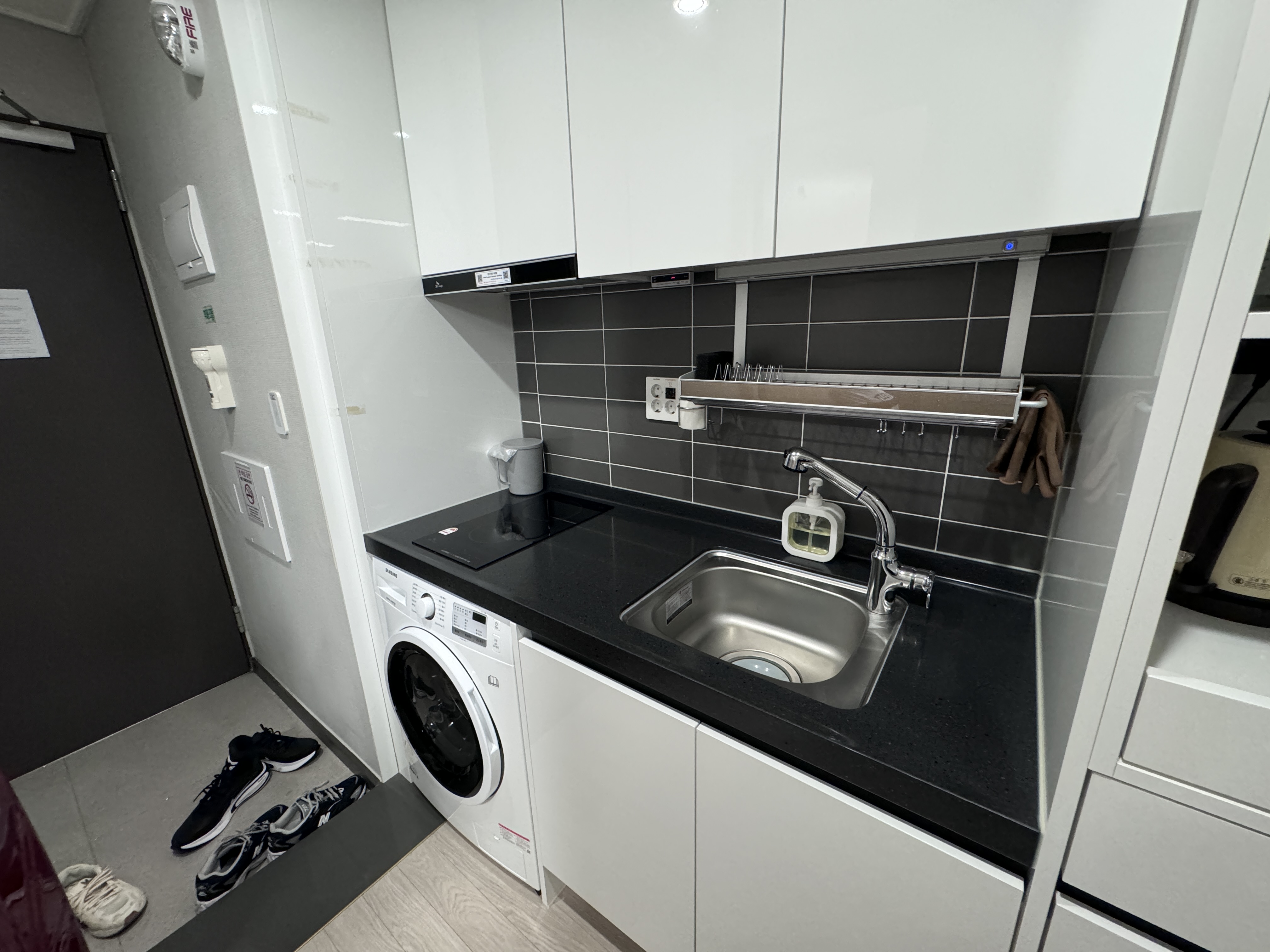 더스테이송도 오피스텔 형식의 숙소여서 안에 세탁기와 TV, 싱크대, 인덕션, 커피포트, 냉장고등이 갖추어져있다.