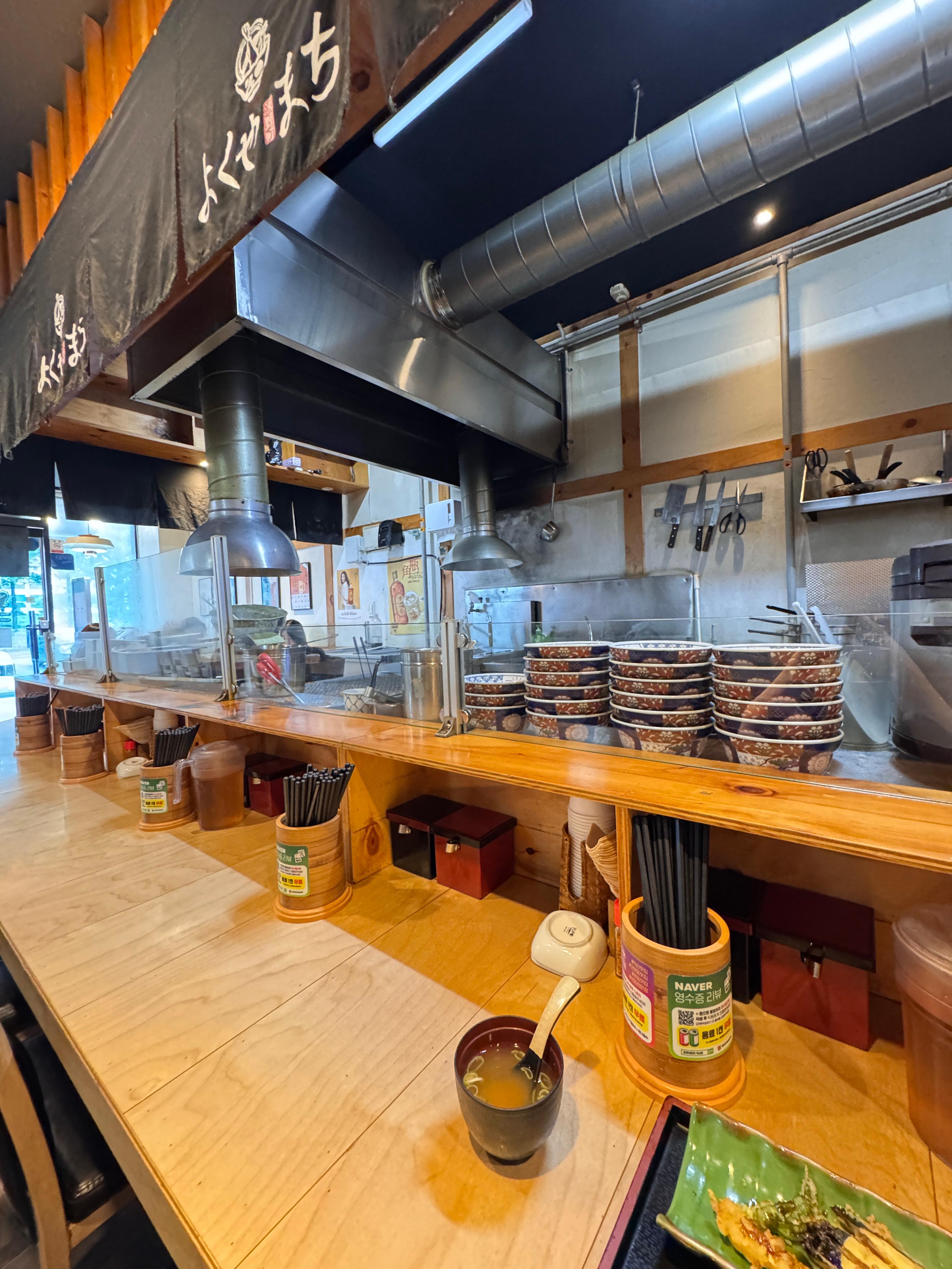 저는 다찌에 앉아 셰프가 튀김과 우동을 만드는 과정을 구경하며 치쿠와텐우동세트가 나오길 기다렸습니다.