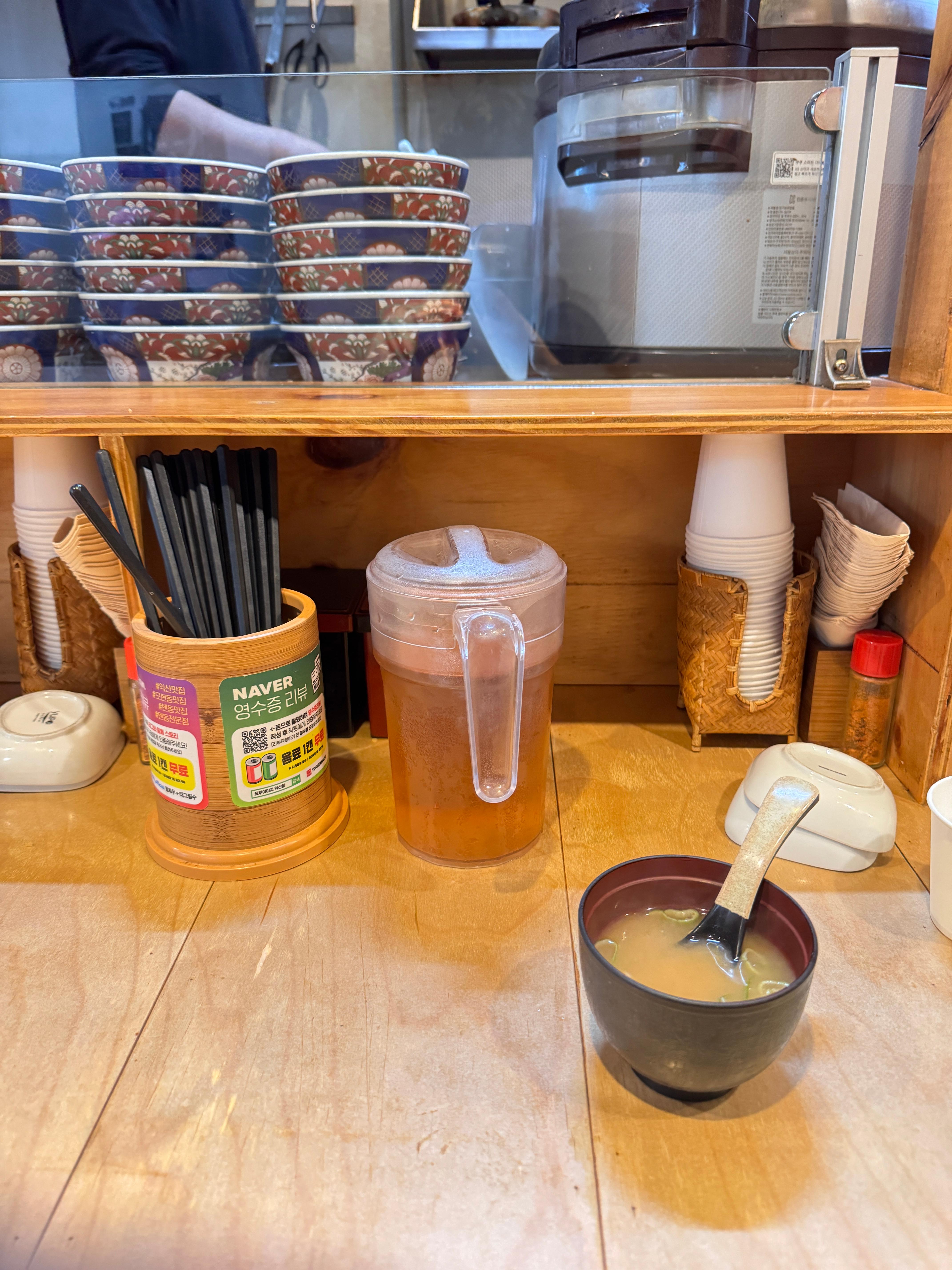 자리에 앉으면 먼저 장국이 제공되는데, 제 입맛에는 조금 짭짤한 편이었어요.