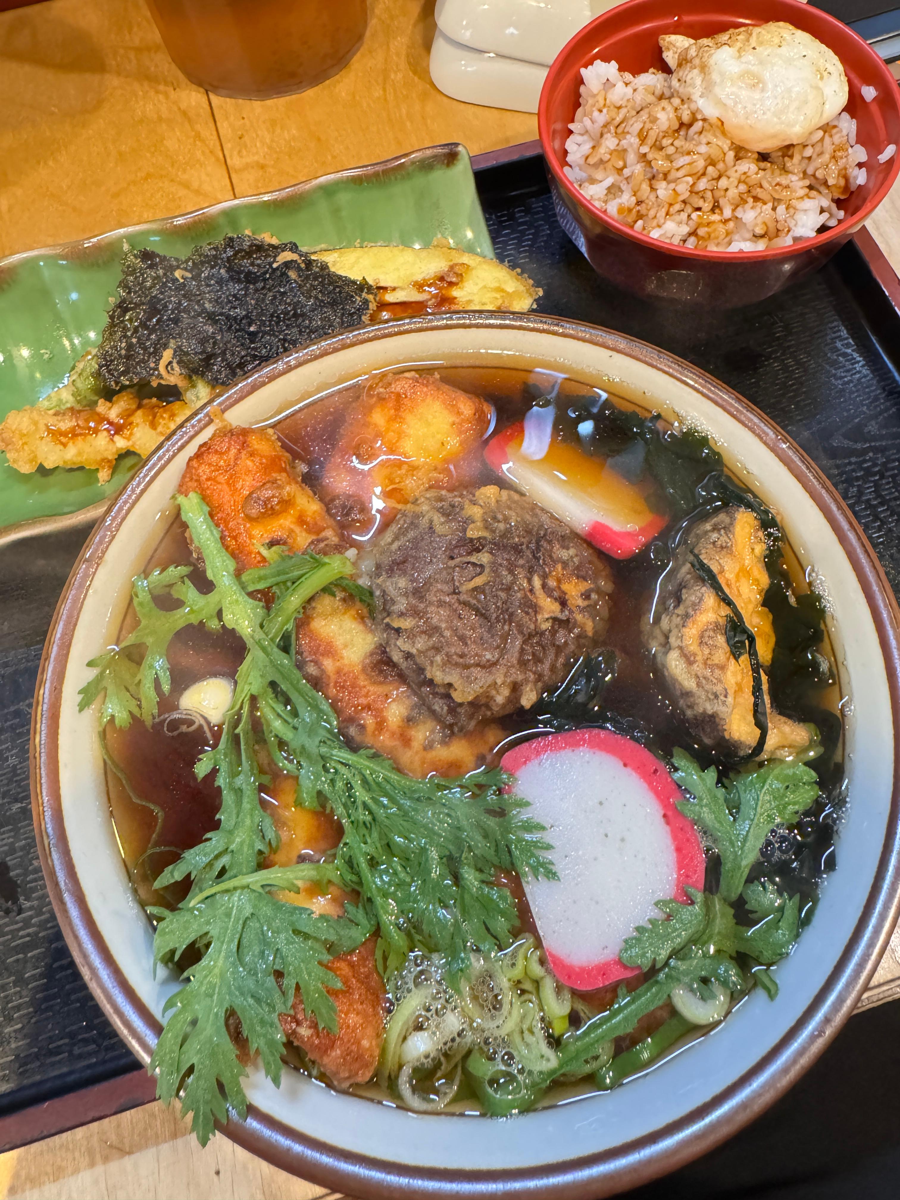 - 치쿠와텐우동 (구운 어묵을 바삭하게 튀긴 치쿠와텐이 올라간 우동)