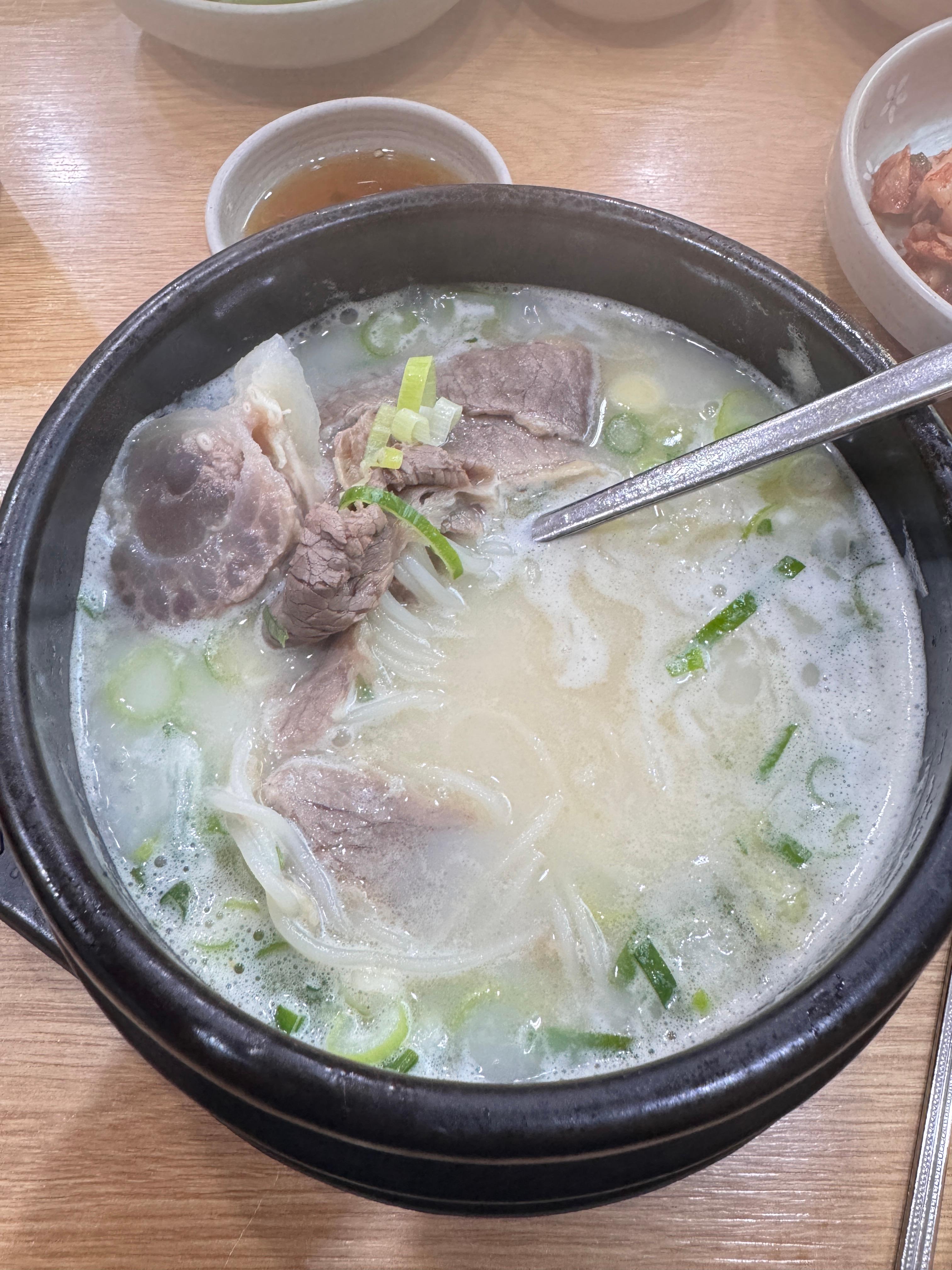 첫 숟갈을 막 뜨자마자, 사골 특유의 깊은 국물 맛이 확 느껴졌고, 잡내가 전혀 없어서 깔끔하고 맛있었습니다.