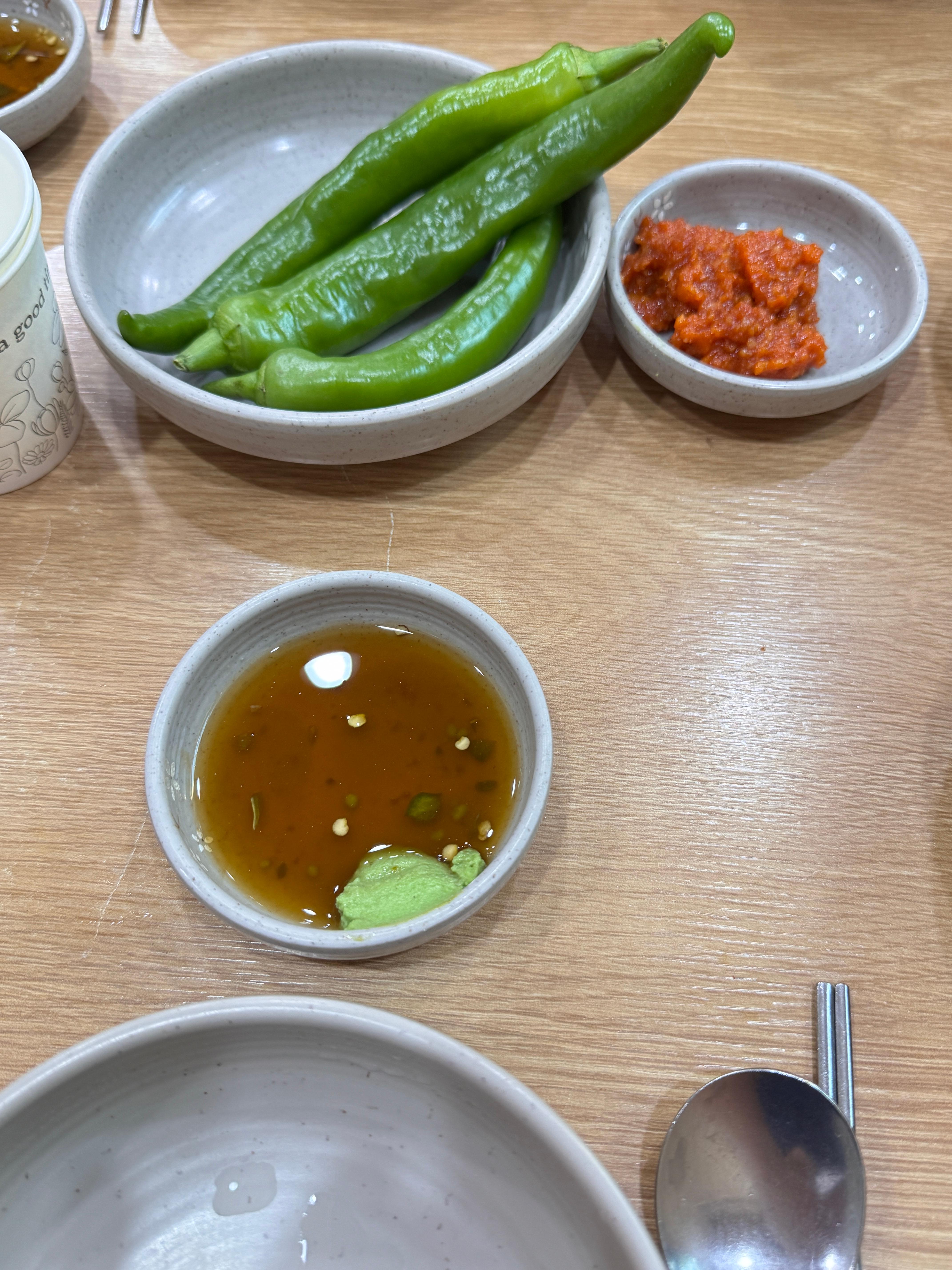 설렁탕을 주문하니 나오는 각종 반찬들입니다. 김치와 깍두기 그리고 고추까지