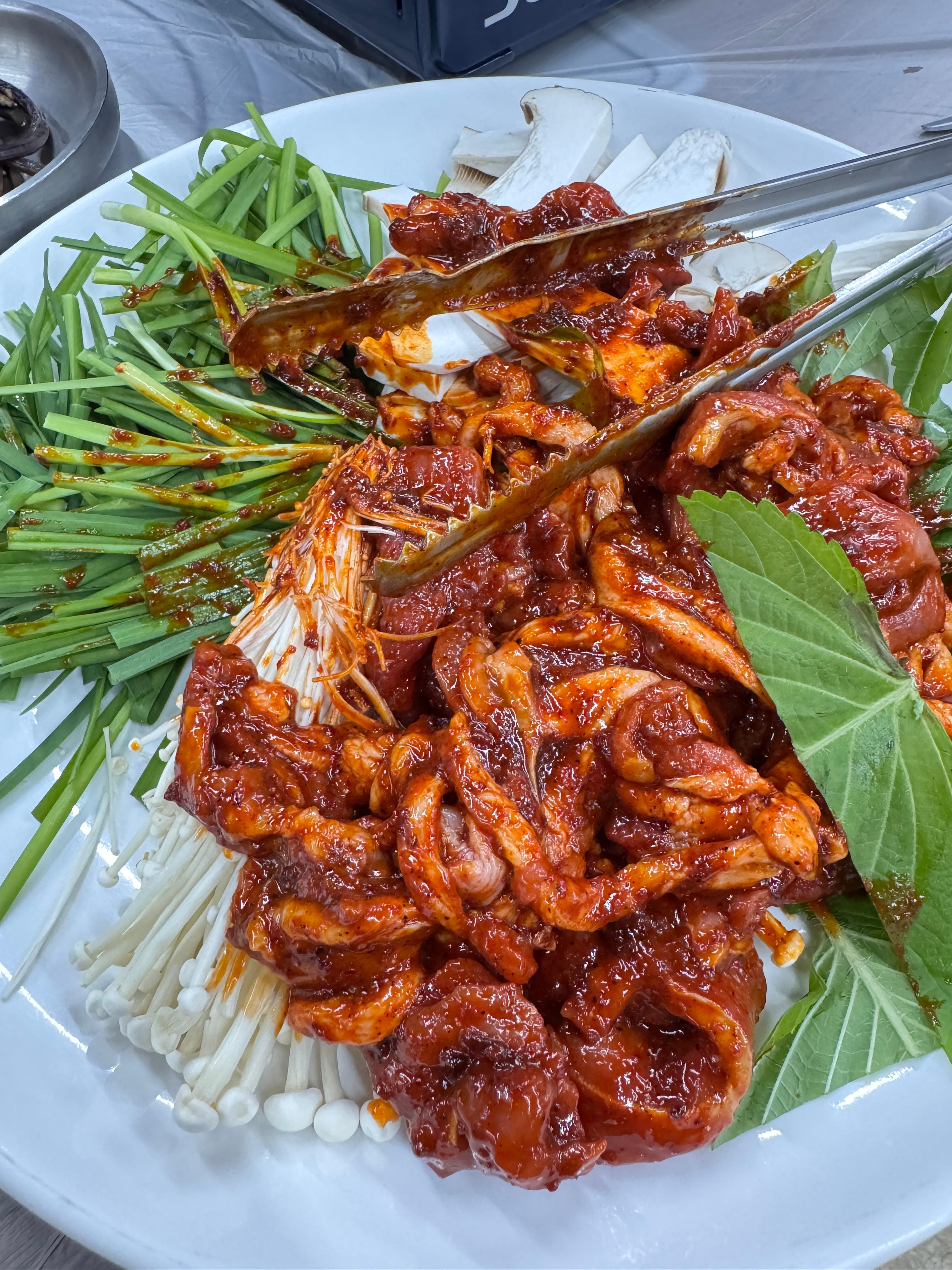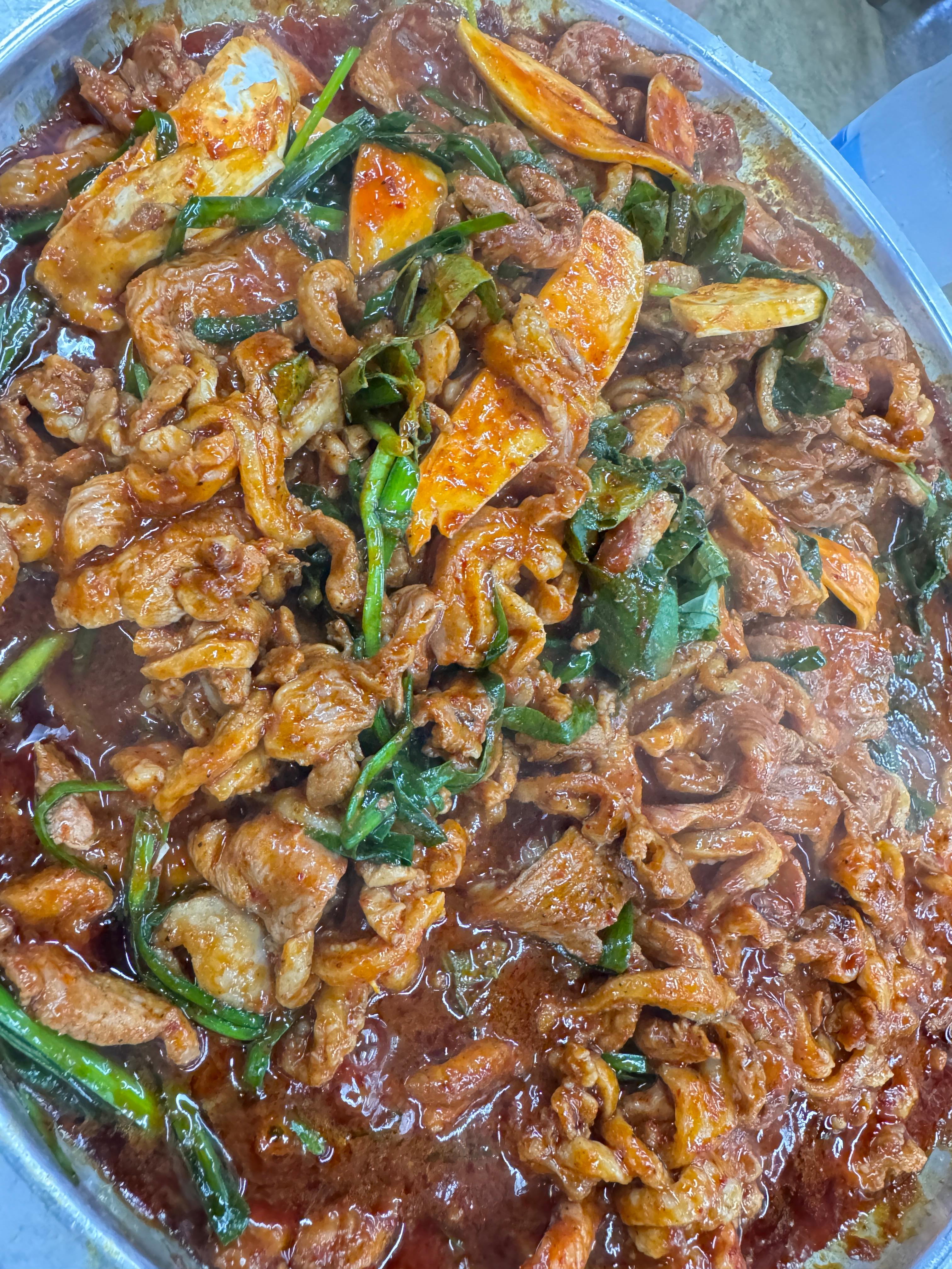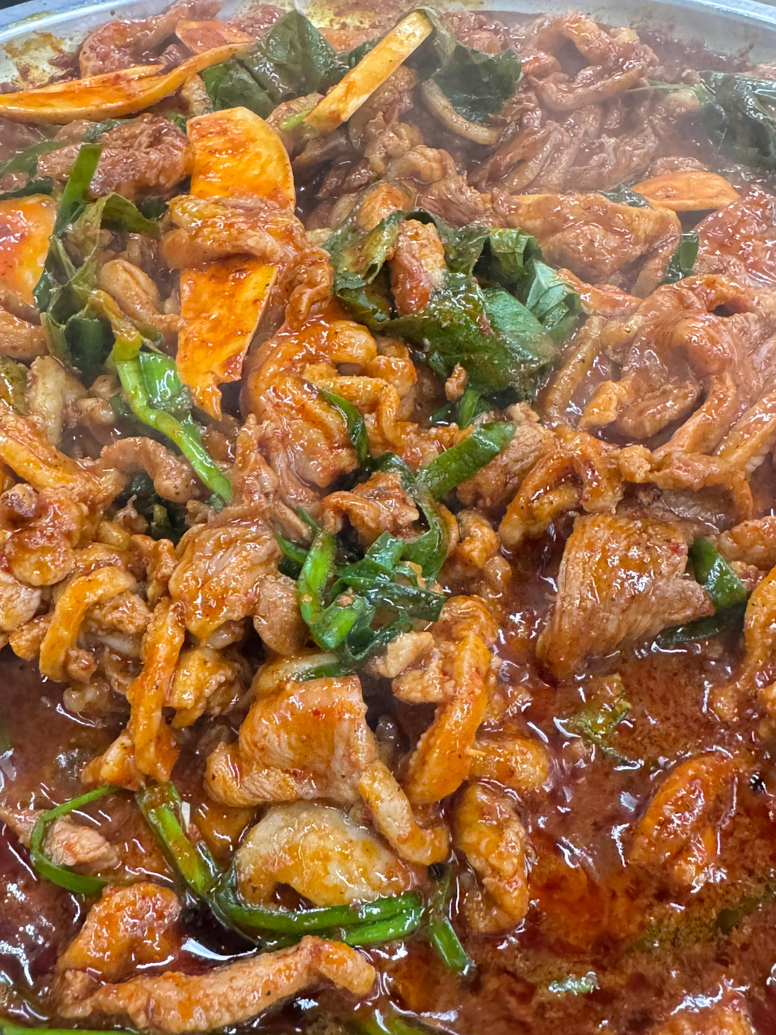 철판 위에 붉은 양념을 입은 오리고기가 올려지고, 불길에 닿자마자 퍼져 나오는 고소한 기름 향이 정말 식욕을 자극했어요.