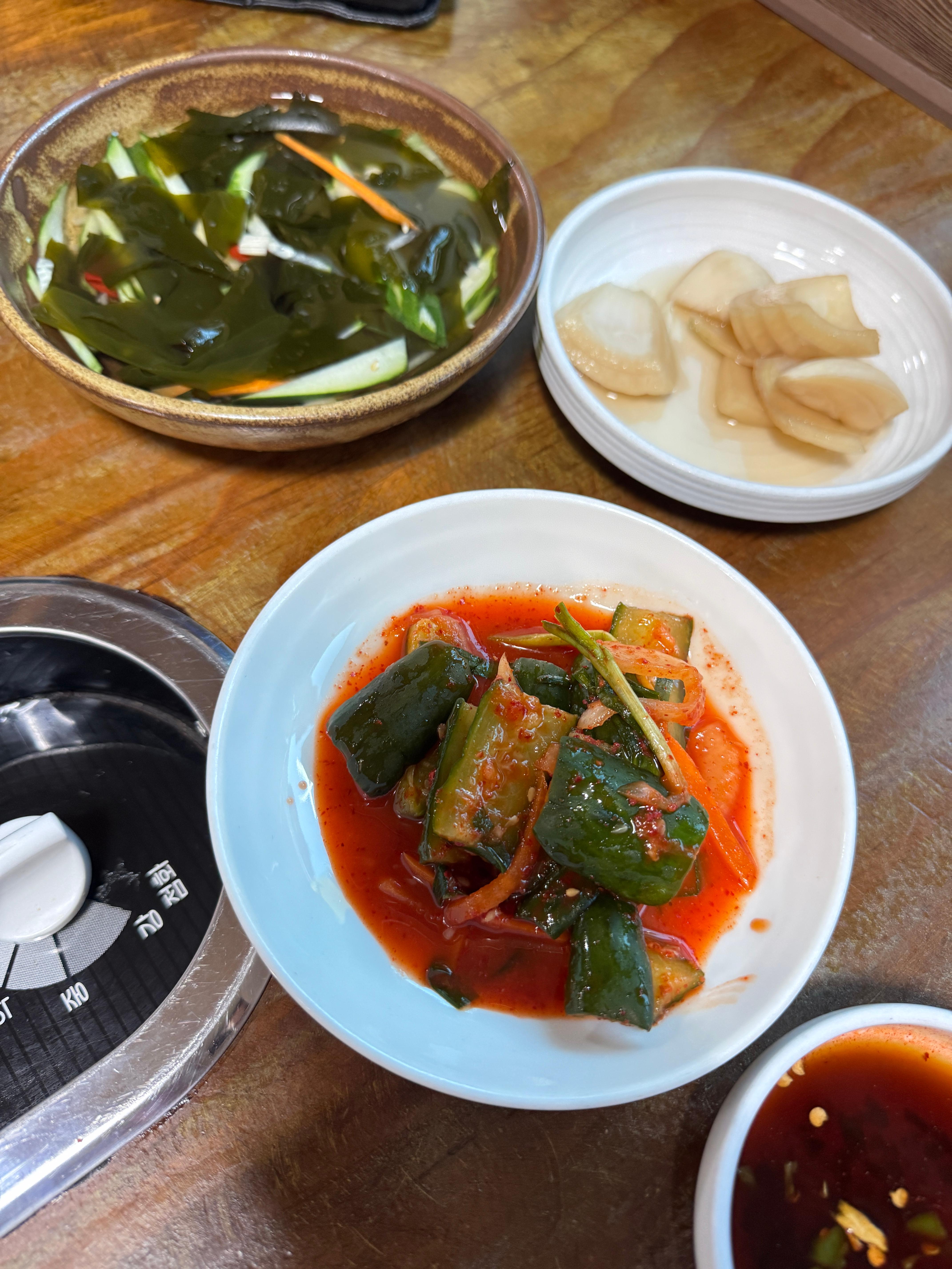 밑반찬 : 냉미역국, 양파간장절임, 오이소박이, 열무김치, 고추, 가지무침